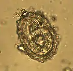 Pigs get infected with A. suum by ingesting infectious parasite eggs that are present in the environment. The larvae of Ascaris complete two moults within the egg; therefore, the larvae emerging from the egg is not a second-stage larva (L2) as was previously presumed, but rather a third stage larva (L3) covered by a loosened L2 cuticle.[3] The larvae hatch from the egg inside the pig's intestines and subsequently start their migration through the body. First, they penetrate the intestinal wall at caecum/colon[4] and use the mesenterial blood veins to migrate to the liver. After burrowing their way through the liver tissue, they again use the efferent blood stream to carry them to the lungs. There, they get stuck in the capillaries surrounding the lungs and they penetrate the lung alveoli. It takes approximately 7 days to reach the lungs. Once the larvae are inside the lung, they migrate up the respiratory tree and are eventually coughed up and swallowed by the host to reach the small intestine again as soon as 10 days after infection. There, the larvae undergo their first molt inside the host to reach the L4 stage by day 14 post-infection. Around day 25 post infection, they develop into the L5 stage. Worms reach adulthood 6 weeks after infection, and when both female and male worms are present in the same host, fertilized eggs are produced and secreted by the female worm. These eggs are then excreted together with the faeces. After an incubation period, infective stage larvae develop in the eggs and are ready to cause infection in a new host.