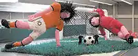 In 2000, Moss and Sorell were commissioned to create a world-record-sized balloon sculpture in Moi, Belgium. They designed and depicted a scene showing two soccer players kicking a ball into a goal. At the time, the sculpture was the largest non-round balloon sculpture in the world. It was constructed of more than 40,750 inflated latex balloons. The installation was built without framing, line or glue and relied only on traditional balloon twisting methods. Forty-two additional crew members and more than 640 man-hours were required to construct the sculptural piece, which stood 25 feet (7.6 m) tall and was roughly 80 feet (24 m) wide. Each of the latex soccer players stood an unprecedented 40 feet (12 m) tall.