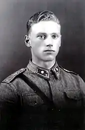 His performance during these engagements was noticed by his commanders, and toward the end of the war, he was assigned to officer training where he was commissioned a Vänrikki (2nd lieutenant) in the reserves.[8] After the Winter War, in June 1941, Törni went to Vienna, Austria for seven weeks of training with the Waffen-SS, and returned to Finland in July; as a Finnish officer, the Germans recognized him as an Untersturmführer.[9] Most of Törni's reputation was based on his successful actions in the Continuation War (1941–44) between the Soviet Union and Finland. In 1943, a unit informally named Detachment Törni was created under his command. This was an infantry unit that penetrated deep behind enemy lines and soon enjoyed a reputation on both sides of the front for its combat effectiveness. One of Törni's subordinates was future President of Finland Mauno Koivisto.[10] Koivisto served in a reconnaissance company under Törni's command during the Battle of Ilomantsi, the final Finnish-Soviet engagement of the Continuation War, during July and August 1944. Törni's unit inflicted such heavy casualties on Soviet units that the Soviet Army placed a bounty of 3,000,000 Finnish marks on his head.[11] He was decorated with the Mannerheim Cross 2nd Class on 9 July 1944.[12]