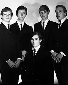 In October 1962, Rocky Shores (drums) recruited Larry Roquemore (saxophone, vocals) and Larry Slater (lead guitar) to perform at a Halloween party, with Slater bringing along rhythm guitarist Tommy Skaggs. Originally, the group's set list included mostly surf music instrumentals inspired by Freddie King, whom the band held a strong admiration for.[1] Following their first gig, Slater and Roquemore began rehearsals in new drummer Mike Griffins' garage, also accompanied by Dan Fletcher (bass guitar) and rhythm guitarist Buddy Bates. In 1964, after establishing themselves as top-tier competitors in battle of the bands tourneys in Fort Worth, Larry and the Blue Notes replaced Fletcher with Randy Cates and recruited Jack Hammonds (organ, vocals).[2] The new members had some prior experience as vocalists, providing the group with enough expertise to replicate the lush vocal harmonies of the Beatles.[3]