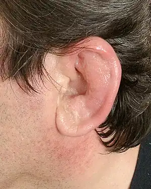 Perichondritis is inflammation of the perichondrium, a layer of connective tissue which surrounds cartilage.[2] A common form, auricular perichondritis (perichondritis auriculae) involves infection of the pinna due to infection of traumatic or surgical wound or the spread of inflammation into depth (e.g. Infected transcartilaginous ear piercings).[3][4] It may lead to severe deformation of the pinna if not treated vigorously with IV antibiotics. The causative organism is usually Pseudomonas aeruginosa. A rare form is laryngeal perichondritis (perichondritis laryngis). It develops suddenly due to an injury, virulent organisms or compromised immune status of the host, and also affects cartilage of the larynx. This may result in deformations and stenoses.