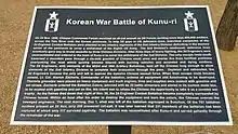 [16] Two coins were placed into the main stone memorial. They are special gold challenge coins. One coin is facing up and the other is facing down. This was in honor of Chaplain Emil J. Kapaun, CPT, US Army, 8th Cavalry Regiment, 1st Cavalry Division. He was awarded the Medal of Honor for his service to his country and fellow soldiers. He died in a Prisoner of War camp on May 23, 1951.[17]