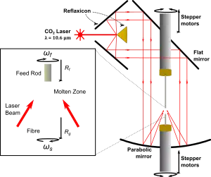 An improvement to the laser-heated crystal growth technique was made by Fejer et al.,[13] who incorporated a special optical component known as a reflaxicon, consisting of an inner cone surrounded by a larger coaxial cone section, both with reflecting surfaces. This optical element converts the cylindrical laser beam into a larger diameter hollow cylinder surface.[14] This optical component allows radial distribution of the laser energy over the molten zone, reducing radial thermal gradients. The axial temperature gradient in this technique can go as high as 10000 °C/cm, which is very high when compared to traditional crystal growth techniques (10–100 °C/cm).