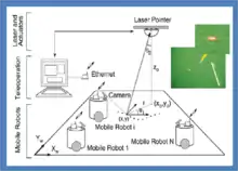 Laser guidance directs a robotics system to a target position by means of a laser beam. The laser guidance of a robot is accomplished by projecting a laser light, image processing and communication to improve the accuracy of guidance. The key idea is to show goal positions to the robot by laser light projection instead of communicating them numerically. This intuitive interface simplifies directing the robot while the visual feedback improves the positioning accuracy and allows for implicit localization. The guidance system may serve also as a mediator for cooperative multiple robots.[1][2] Examples of proof-of-concept experiments of directing a robot by a laser pointer are shown on video.[3][4] Laser guidance spans areas of robotics, computer vision, user interface, video games, communication and smart home technologies.