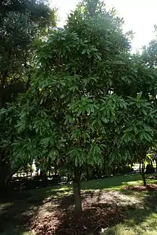 L. grandis grows naturally only in the rainforests of the Wet Tropics region of northeastern Queensland, from about 0 to 460 m (0 to 1,509 ft) altitude.[5][10][12][15] L. grandis trees received their name for growing to the largest size of the macadamia group,[5] of up to about 40 m (130 ft), with trunks up to 120 cm (47 in) diameter, with some having buttresses. L. grandis has an official Queensland state conservation status of "vulnerable" species in the Queensland government Nature Conservation Act 1992.[18]
