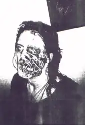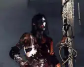 In preparation for the upcoming Last Rights shows, Ogre and William Morrison recorded and edited sixty-six minutes of backing video to sync up with the live performances.[26] This footage was recorded at the same time as the "Killing Game" music video, which was intended to be a sample of the live show.[42] Meanwhile, Gore was designing and fabricating the tour's many props and Ogre's many costumes. The two main elements, a virtual reality machine and a spinning display of severed heads called the Tree of No Cares, were set up on either side of the stage.[42] The VR apparatus, into which Ogre occasionally went throughout the performance, represented his addiction[42] and eventually came to mutate him.[43] The backing film was timed so that whenever Ogre entered the machine, his face would appear onscreen and the audience could watch as something attacked and tortured him.[42] Each time Ogre emerged from the apparatus, he would be altered. Gore also designed an elaborate full-body suit known as the Guiltman.[3] Only appearing for the performance of "Left Handshake" at the end of each show, the Guiltman combined imagery of drug abuse and deformed sexuality to represent Ogre at the lowest point of addiction.[42]