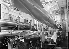 Norfolk was the first ship to sight the Bismarck in the morning of 27 May. In bad visibility the cruiser stumbled upon an unidentified ship, flashing recognition signals before realizing it was the German battleship. Norfolk quickly turned away and made contact with the British battleships before joining the final battle.[35] At 08:43, lookouts on King George V spotted Bismarck, some 25,000 yd (23,000 m) away; Rodney opened fire first at 08:47, followed quickly by King George V. Bismarck was unable to steer due to the torpedo damage to the rudders, and the consequent unpredictable motions made the ship an unstable gun platform and created a difficult gunnery problem. This was further complicated by the gale-force storm.[37] However Bismarck returned fire at 08:50 with her forward guns, and with her second salvo, she straddled Rodney. This was the closest she came to scoring a hit on any British warship in the final engagement,[38] because at 09:02, a 16-inch (406 mm) salvo from Rodney struck the forward superstructure, damaging the bridge and main fire control director and killing most of the senior officers. The salvo also damaged the forward main battery turrets. The aft fire control station took over direction of the aft turrets, but after three salvos was also knocked out. With both fire control stations out of action, Bismarck's shooting became increasingly erratic, allowing the British to close the range. Norfolk and Dorsetshire closed and began firing with their 8 in (203 mm) guns.[39][40] Around 09:10 the Norfolk fired four and the Rodney fired six torpedoes from a distance of more than 10 km, but no hits were observed.[41]