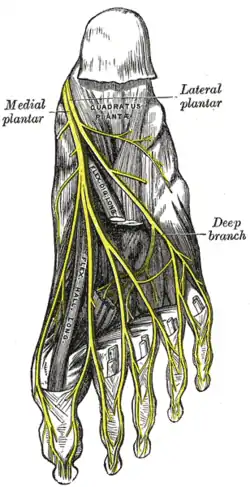 The lateral plantar nerve (external plantar nerve) is a branch of the tibial nerve, in turn a branch of the sciatic nerve and supplies the skin of the fifth toe and lateral half of the fourth, as well as most of the deep muscles, its distribution being similar to that of the ulnar nerve in the hand.