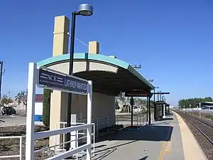 Lathrop/Manteca station is a train station in southern Lathrop, California, served by Altamont Corridor Express (ACE) service. The station is located on rail tracks and a rail yard that is on land that was once a turkey farm.[3] It is three miles (4.8 km) from Lathrop and one and a half miles (2.4 km) from Manteca to the east, a location chosen to draw commuters from both cities.[3]