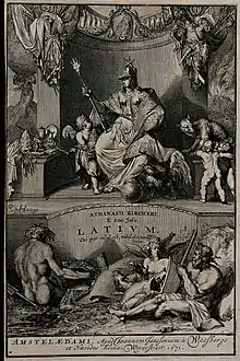 The frontispiece was by Romeyn de Hooghe. It depicted a seated figure of the genius loci Latia. On one side of her stands a mountain on which Atlas hold up the world, and on the other figures a volcano. These emblems represent, perhaps, the temporal and spiritual power of Rome respectively. Above her hang both ancient and contemporary arms. Romulus and Remus and their she-wolf adopted mother play behind her back while a putto presents her with the papal tiara and the keys of Saint Peter. She is wearing regalia that show that her presence and her power are intimately connected with the Catholic Church.[3] Her crown identifies her as the protector of a city, and the star above it is the symbols of the Chigi family to which Pope Alexander VII belonged. She holds a long sceptre topped with the hand of justice and her eyes fall on a mitre, a cardinal's hat, and other Catholic religious objects. Her robe covers the imperial eagle and her foot rests on the orb of temporal power, indicating her primacy over the Holy Roman Emperor. Beneath Latia is inscribed the Latin motto 'Latium cui par nihil est, nihil Secundu' ('Latium, to which none is equal, and second to none'). At the bottom of the illustration the male figures are the gods of the river Tiber and its Tivoli tributary the Aniene. The female figure with butterfly wings is the goddess of the Aniene, otherwise Ino, resting on symbols of her mythological shipwreck.[4]: 39