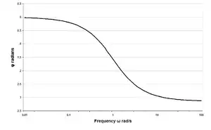 The prototype lattice filter shown here passes low frequencies without modification but phase-shifts high frequencies. That is, it is phase correction for the high end of the band. At low frequencies the phase shift is 0° but as the frequency increases the phase shift approaches 180°. It can be seen qualitatively that this is so by replacing the inductors with open circuits and the capacitors with short circuits, which is what they become at high frequencies. At high frequencies the lattice filter is a cross-over network and will produce 180° phase shift. A 180° phase shift is the same as an inversion in the frequency domain, but is a delay in the time domain. At an angular frequency of ω = 1 rad/s the phase shift is exactly 90° and this is the midpoint of the filter's transfer function.