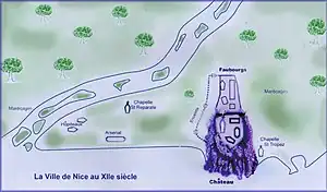 Laugier was described as rector of Nice in 981. He gave land to the cathedral of Nice in 1003.[11] He was co-lord of Vence around 1005, so he is also known as Laugier of Vence, but should not be confused with Laugier Ruffi who defended Vence against the Saracens and who gave his daughter as a ransom in 973.[12] We know that Laugier was a rich and powerful landowner from the Alps whose second marriage was to Odile of Provence, widow of Miron of Nice.[13] He became co-lord of Nice, but not viscount, according to archival documents.