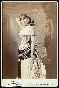 Laura Don began her acting career with a traveling troupe performing in Brooklyn and later spent time with John Ellsler's company in Cleveland. By August 1875, (as Laura Don) she was playing Ophelia to E. L. Davenport's Hamlet at New York's Grand Opera House.[4] At the same venue that September, she played Isabel, the principle female lead in The Pioneer Patriot: or the Dawn of Liberty with Harry Watkins and Joseph F. Wheelock[5] and in July 1876 at Hooley’s Theatre in Brooklyn, the Spanish beauty, Donna Jovita Castro, in Bret Harte's Two Men of Sandy Bar.[6] At Booth's Theatre in late 1878 she was Mary Meredith in Our American Cousin to George Parkes’ Lord Dundreary and Frank Hardenberg's Asa Trenchard,[7] and the following January she appeared at The New Fifth Avenue Theatre in Dr. Clyde as Lady Hammond.[8] On June 16, 1880, Don sailed for England aboard the Cunard liner S.S. Seythia with Frank Mayo's company[9] and was back in New York by that September to assume the role Antonia in Archibald Clavering Gunter's Two Nights in Rome during the closing days of its run at Union Square Theatre.[10][11] On February 7, 1881, Don began a two-month run as Erima in Fresh, the American[12] and on November 28 of that year she starred in the American debut of George Robert Sims' My Mother-in-Law, both staged at Abbey's Park Theatre on 932 Broadway, New York.[9]