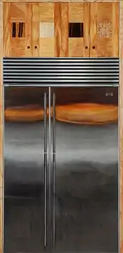 - Refrigerator Portrait Series (2001) - In this series Kina comments on class, family, and identity, by creating trompe-l'oeil depictions of household refrigerators. The refrigerators are titled after their masters, all members of Kina's extended family. The paintings convey something about their owners' identities through magnets, drawings, rings, and other protrusions appearing on their doors. This series deals with the ever-blurring boundaries between race, religion, and national identity. One of the paintings, titled "The Rosenfelds," depicts a high end Sub-Zero refrigerator made of shining steel and surrounded by custom wood cabinetry and foliage. Unlike the other works in this series, this refrigerator's surface is unadorned. In its stark simplicity, its formal presence invokes the work of Mark Rothko and Barnett Newman.[8][9] "While the variety of adornments on the Kina-Aronson fridge indicates a multiplicity of identities, the interiors of the refrigerators, and, by extension, the inner lives of their owners, remain closed to the viewer".[10]