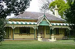 Laurel Bank is a single storey Victorian cottage in the Italianate style. Most of the original external features of the building are still intact.[1] A large verandah with cast-iron columns and intricately decorated cast-iron valances extends laid out in a fine bordered chequerboard pattern. The entrance doorway and surrounding fan lights and side-lights are emphasised by a gable feature which carried over the bullnose verandah roof, and is framed by twin decorated columns. The verandah gable is decorated with an ornate timber barge.[1]