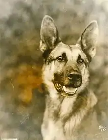 Knowing what qualities a dog needs to be a success in motion pictures — particularly the ability to register feelings that actual conditions do not warrant — Trimble set out to select a German Shepherd dog for his next canine actor. After extensive research he narrowed the field to three specific dogs, one of them in Germany and two in the U.S.[15] In the autumn of 1920, Trimble found a dog at a kennel in White Plains, New York.[16][17] Etzel von Oeringen was a male German Shepherd born in 1917.[18] He was trained in Berlin as a police dog and served in the German Red Cross during World War I.[19] At age three the dog was brought to the United States to be sold. Trimble recognized Etzel's potential and persuaded Jane Murfin, a screenwriter for his films, to buy the dog.[20] A new name, Strongheart, was suggested by the publicity department of First National Pictures, which released his first film.[21]