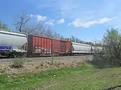 ![]() A Laurinburg and Southern boxcar passes through Norman, Oklahoma, on April 7, 2018. | |