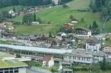 Lauterbrunnen is a railway station in the village and municipality of Lauterbrunnen in the Swiss canton of Bern. The station is on the Berner Oberland Bahn (BOB), whose trains operate services to Interlaken Ost. It is also the valley terminus of the Wengernalpbahn (WAB), whose trains operate to Kleine Scheidegg via Wengen, and of the Bergbahn Lauterbrunnen-Mürren (BLM), whose hybrid cable car and rail link runs to Mürren.[1][4] Before 2006, this was a funicular (Seilbahn Lauterbrunnen–Grütschalp).