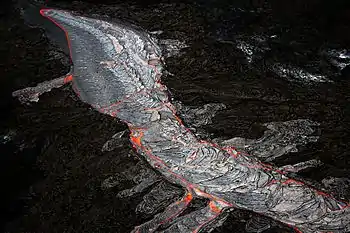 Pāhoehoe lava flow on the Big Island of Hawaii The picture shows overflows from a main lava channel. The channel is crusting over with a v-shaped opening pointing upstream (top left). The main channel and overflows show the perched nature of this kind of lava channel. Red liquid lava is breaking through ephemeral levees at the overflows.
