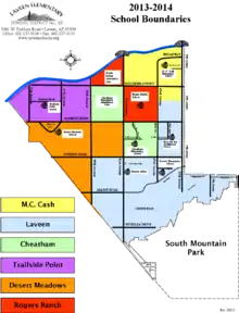Laveen was a one-school district until the opening of Maurice C. Cash School in the early 1960s, which was built on land donated by Mr. Cash, a Laveen farmer.[4] Both schools, Laveen and M. C. Cash, served kindergarten through 8th grade until the third school, Vista del Sur Middle School, opened in 1998. At that time, Laveen School and M. C. Cash School ended with the sixth grade with Vista del Sur serving seventh and eighth grades.
