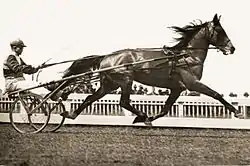 Lawn Derby travelled to Tasmania for Easter racing in 1935 but did not figure in the finish of the Easter Cup.[4] He began serving mares in 1935 and as a result was not able to travel to Perth for the first running of the Inter Dominion at Gloucester Park.[5] At the Sydney Showgrounds in 1936 Lawn Derby recorded a time of 2:03 1/5 in a time trial, the second fastest recorded in Australia at the time behind only Walla Walla.[6] In 1937 Lawn Derby contested the Inter Dominion at Wayville Showgrounds, Adelaide. Lawn Derby won on the first night of the Championships[7] and later "won" a heat on the second night but the race was found to have been run a lap short and was re-run with Lawn Derby out of the placings.[8] In the final he was a close fourth behind Dan's Son[9] and a week later in a time trial he recorded a mile in 2:05 which was the fastest time recorded in the state of South Australia.[10] Lawn Derby travelled to Tasmania for the Easter racing and won the Easter Cup from an 84 yards handicap[11] and was second in the Easter Plate from 148 yards behind.[12] He then won the Northall Champion Stakes in Hobart from a 108 yards handicap.[13]