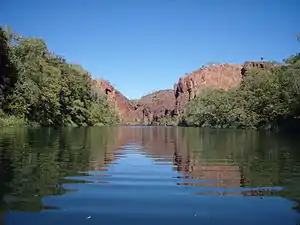 On the sandstone hills are spinifex, acacias, eucalypts and grevilleas.[4][11] Growing on the river plains are western bloodwoods and mitchell grass.[11] Paperbarks, river red gums, figs, ferns, pandanus and cabbage palms are found along the creek and river banks.[4][11] A diverse range of aquatic plants such as waterlilies, ferns, mosses, sedges and bulrushes grow in the creeks.[1]