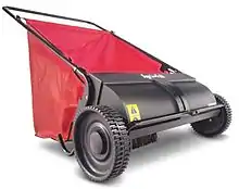 A lawn sweeper, also known as a leaf sweeper or lawn brush, is a garden tool for the mechanical removal of debris, such as fallen leaves, pine needles, twigs, grass clippings or litter, from a lawn or paved area. Lawn sweepers operate via a rotating brush mechanism that sweeps up the debris and deposits it in a collection hopper for disposal.