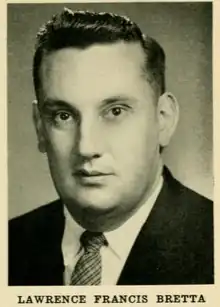Lawrence Francis Bretta (January 12, 1928 – September 2, 2006) was a Massachusetts businessman and politician who served in the Massachusetts House of Representatives and as the Mayor of Somerville, Massachusetts. He was regional director of the General Service Administration until his resignation in February, 1984 while under investigation on corruption charges. He pleaded guilty to a federal indictment alleging solicitation and acceptance of bribes on connection with the location of a federal Social Security office in the Mystic Mall in Chelsea, Massachusetts[7] and was sentenced to four years in prison. He was released in 1988.