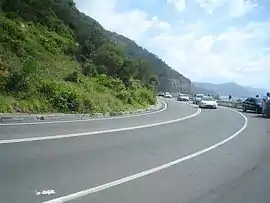 The road begins at the Old Princes Highway, Helensburgh[2] (Princes Motorway exit) and passes through Stanwell Tops to descend the steep Illawarra Escarpment at Bald Hill, the site of a spectacular lookout and hang gliding area. The road then passes south through Stanwell Park and Coalcliff to cross the Sea Cliff Bridge and adjoining Lawrence Hargrave Drive Bridge. Together, the Sea Cliff Bridge and Lawrence Hargrave Drive Bridge construction were completed in December 2005, replacing the former cliff-hugging route which was prone to rockfalls and consequent closures.[3] Remnants of the former road can still be seen to this day, including some of the guard rail and most of the road section which is now overgrown with trees and ridden with boulders and rocks that have fallen freely since the roads closure, essentially acting as a ditch.