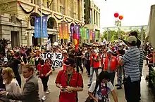 Queensland follows the federal legislation Australia has created on protests and demonstrations whilst also having laws at the state level. Any public assembly or demonstration needs to give notice to the local police force five working days prior to the assembly being held.[9] Opposition to the assembly will only occur if the demonstration will dispute the law. In Queensland the Peaceful Assembly Act allows the right for protests to be held and will only be restricted if public safety, public order or the protection of rights and freedoms is infringed.[10]