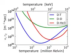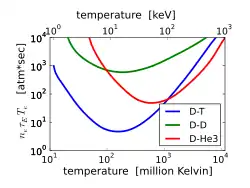 A still more useful figure of merit is the "triple product" of density, temperature, and confinement time, nTτE. For most confinement concepts, whether inertial, mirror, or toroidal confinement, the density and temperature can be varied over a fairly wide range, but the maximum attainable pressure p is a constant. When such is the case, the fusion power density is proportional to p2<σv>/T 2. The maximum fusion power available from a given machine is therefore reached at the temperature T where <σv>/T 2 is a maximum. By continuation of the above derivation, the following inequality is readily obtained: