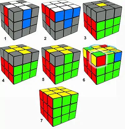 The method begins with the puzzle solver making a cross on one face with the edge pieces ensuring that all edge colours match the adjacent center colours (step 1 in the diagram below), then putting the corners into position between the edges (step 2). By then, the layer should be solved. In step 3, the four edge pieces of the middle layer are solved. At this point the first two layers are solved. In step 4, a cross of the opposite color is made on the last layer. For step 5, the last layer edges are permuted (swapped around). In step 6, the last layer corners are permuted. Finally, the last layer corners are oriented.[5]