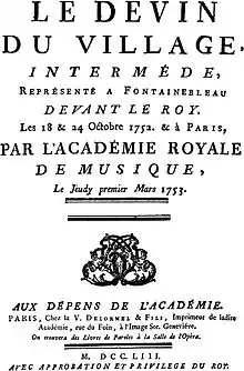 Le devin du village ("The Village Soothsayer") is a one-act French opera (intermède) by Jean-Jacques Rousseau, who also wrote the libretto. It was the first work in the repertory of the Académie Royale de Musique for which the text and music were by the same author.[1]