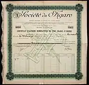 Le Figaro was founded as a satirical weekly in 1826,[11][12] taking its name and motto from Le Mariage de Figaro, the 1778 play by Pierre Beaumarchais that poked fun at privilege. Its motto, from Figaro's monologue in the play's final act, is "Sans la liberté de blâmer, il n'est point d'éloge flatteur" ("Without the freedom to criticise, there is no flattering praise"). In 1833, editor Nestor Roqueplan fought a duel with a Colonel Gallois, who was offended by an article in Le Figaro, and was wounded but recovered.[13] Albert Wolff, Émile Zola, Alphonse Karr, Théophile Gautier, and Jules Claretie were among the paper's early contributors. It was published somewhat irregularly until 1854, when it was taken over by Hippolyte de Villemessant.