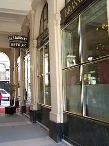 Le Grand Véfour (French pronunciation: [lə ɡʁɑ̃ vefuʁ]), the first grand restaurant in Paris,[1] France, was opened in the arcades of the Palais-Royal in 1784 by Antoine Aubertot, as the Café de Chartres,[2] and was purchased in 1820 by Jean Véfour,[3] who was able to retire within three years, selling the restaurant to Jean Boissier.[4] A list of regular customers over the last two centuries includes most of the heavyweights of French culture and politics, along with le tout-Paris.[5] Sauce Mornay was one of the preparations introduced at the Grand Véfour. Closed from 1905 to 1947, a revived Grand Véfour opened with the celebrated chef Raymond Oliver in charge in the autumn of 1948. Jean Cocteau designed his menu.[6] The restaurant, with its early nineteenth-century neoclassical décor of large mirrors in gilded frames and painted supraportes, continues its tradition of gastronomy at the same location, "a history-infused citadel of classic French cuisine."[7]