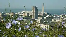 Le Havre belongs to the Paris Basin which was formed in the Mesozoic period. The Paris Basin consists of sedimentary rocks. The commune of Le Havre consists of two areas separated by a natural cliff edge: one part in the lower part of the town to the south including the harbour, the city centre and the suburbs. It was built on former marshland and mudflats that were drained in the 16th century.[13] The soil consists of several metres of alluvium or silt deposited by the Seine.[13] The city centre was rebuilt after the Second World War using a metre of flattened rubble as a foundation.[14][15]