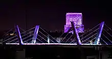 The building is lit with colorful lights during the night. These lights are set to different colors on different nights, so the hotel can appear in many different colors depending on the night.