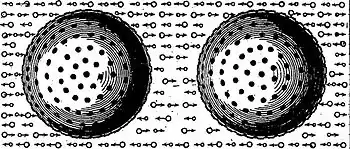 Samuel Tolver Preston[24] illustrated that many of the postulates introduced by Le Sage concerning the gravitational particles, such as rectilinear motion, rare interactions, etc.., could be collected under the single notion that they behaved (on the cosmological scale) as the particles of a gas with an extremely long mean free path. Preston also accepted Kelvin's proposal of internal energy modes of the particles. He illustrated Kelvin's model by comparing it with the collision of a steel ring and an anvil – the anvil would not be shaken very much, but the steel ring would be in a state of vibration and therefore departs with diminished velocity. He also argued, that the mean free path of the particles is at least the distance between the planets – on longer distances the particles regain their translational energy due collisions with each other, so he concluded that on longer distances there would be no attraction between the bodies, independent of their size. Paul Drude suggested that this could possibly be a connection with some theories of Carl Gottfried Neumann and Hugo von Seeliger, who proposed some sort of absorption of gravity in open space.[25]