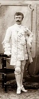 During the 1870s Lecocq had supplanted Jacques Offenbach as Paris's favourite composer of comic operas.[1] He had been chiefly associated with the Théâtre de la Renaissance, where his Giroflé-Girofla (1874), La petite mariée (1875) and Le petit duc (1878) were particularly successful.[1] Having quarrelled with the director of the Renaissance, Victor Koning, Lecocq had transferred his allegiance to the Théâtre de Nouveautés, where in 1881 he had a box-office hit with Le jour et la nuit[2] Le cœur et la main was written to succeed it. The librettists, both new partners for the composer, were experienced, particularly Nuitter, who had collaborated extensively with Offenbach in the 1860s and 1870s.[3] They continued with the theme, familiar from earlier Lecocq operas, of thwarted and confused wedding nights with a happy ending.[4]