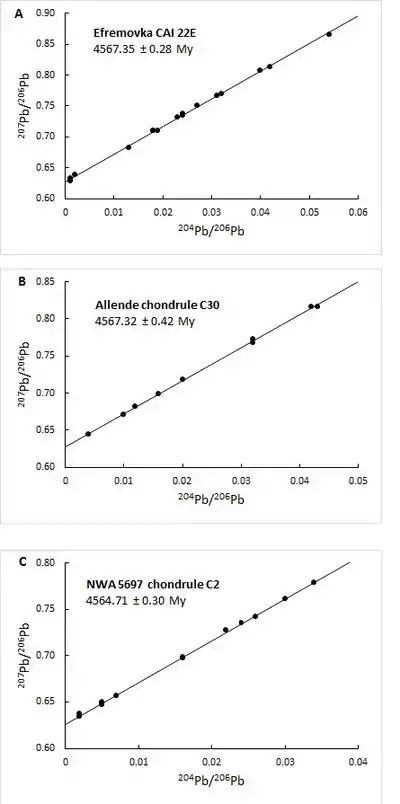 - Amelin, Y.; Krot, Alexander N.; Hutcheon, Ian D.; Ulyanov, Alexander A. (2002). "Lead Isotopic Ages of Chondrules and Calcium-Aluminum-Rich Inclusions". Science. 297 (5587): 1678–1683. Bibcode:2002Sci...297.1678A. doi:10.1126/science.1073950. PMID 12215641. S2CID 24923770.