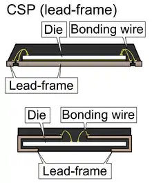 Most kinds of integrated circuit packaging are made by placing a silicon chip on a lead frame, wire bonding the chip to the metal leads of the lead frame, and covering the chip with plastic. The metal leads protruding from the plastic are then either "cut long" and bent to form through-hole pins, or "cut short" and bent to form surface-mount leads. Such lead frames are used for surface mount packages with leads – such as Small Outline Integrated Circuit Quad Flat Package  – and for through-hole packages such as dual in-line package  – and even for so-called "leadless" or "nolead" packages[1][2] – such as Quad Flat Noleads package.