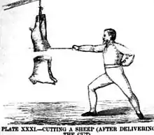 The Leadcutter sword or lead cutter is a type of broad, heavy, specialist English sword or cutlass.[1] Popular in the 19th century, these weapons resemble an enlarged naval cutlass, consisting of single-edged, flatbacked blades with broad widths, often flexible and sometimes slightly curved, always with a full cutlass-type hilt.[2] The swords, heavier than standard cutlasses, were designed for strength training and for "sword feats" (most often the severing of specially made triangular lead bars, hence the name). These displays often included the dissevering of whole sheep's carcasses and of balanced lead bars in a single blow.[3] A prominent manufacturer of Leadcutters was Wilkinson Sword, who produced the sword in four sizes; Model 1 being the lightest, and Model 4 being the largest and heaviest. A Model 2 blade measures in at 31 inches in length and 1.75 inches in width, with a model 3 blade 33 inches long and 2 inches wide.[4][5]