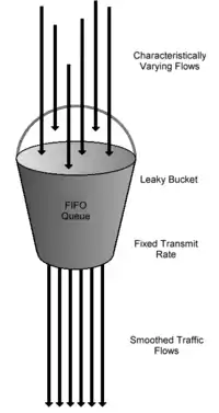 The leaky bucket as a queue is essentially a way of describing a simple FIFO buffer or queue that is serviced at a fixed rate to remove burstiness or jitter. A description of it is given by Andrew S. Tanenbaum, in (an older version of) his book Computer Networks as "The leaky bucket consists of a finite queue. When a packet arrives, if there is room on the queue it is appended to the queue; otherwise it is discarded. At every clock tick one packet is transmitted (unless the queue is empty)".[3] An implementation of the leaky bucket as a queue is therefore always a form of traffic shaping function.