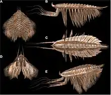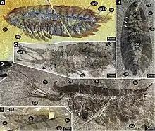Leanchoilia is a megacheiran arthropod known from Cambrian deposits of the Burgess Shale in Canada and the Chengjiang biota of China.[1] It was about 5 centimetres (2.0 in) long and had long, whip-like flagellae extending from its great appendages. Its internal organs are occasionally preserved within the substrate in three dimensions.[2][3]