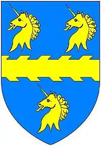 Arms of Lear: Azure, a fess raguly between three unicorn's heads erased or, as visible on the mural monument to Sir Peter Lear in Bishopsteignton Church, Devon