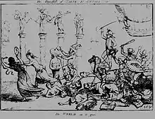 The 1784 print The Downfall of Taste and Genius, or, The World As it Goes by Samuel Collings ridicules "the taste that prefers the Dancing Dogs, the Learned Pig, and Harlequin to Shakespeare". This was a "recurrent theme" of prints at the time.[9] The print depicts the pig leading a procession of performing animals who knock over figures representing the fine arts while copies of Shakespeare's and Pope's works are trampled underfoot by the animals.[9][10]
