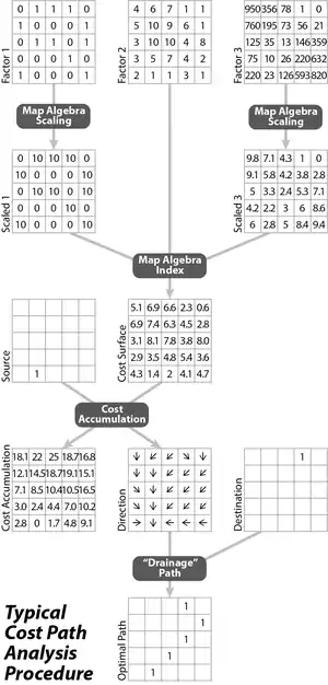The primary data set used in cost distance analysis is the cost raster, sometimes called the cost-of-passage surface,[9] the friction image,[8] the cost-rate field, or cost surface. In most implementations, this is a raster grid, in which the value of each cell represents the cost (i.e., expended resources, such as time, money, or energy) of a route crossing the cell in a horizontal or vertical direction.[10] It is thus a discretization of a field of cost rate (cost per linear unit), a spatially intensive property. This cost is a manifestation of the principle of friction of distance.