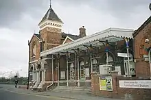 The Mole Gap through the North Downs had been identified as a potential railway corridor as early as the 1830s, but the line south from Leatherhead to Dorking was not opened until 1867.[68] The Kingston Road station, which had been laid out as a terminus, was closed and two new adjacent stations (either side of the present Station Approach) were opened. The LBSCR station, which was closer to the town centre, was initially the only one connected to the line to Dorking. It was designed by C. H. Driver in a fine gothic revival style and is the station that survives today.[67][69] The LSWR built its station as a terminus, but its line was extended westwards to Bookham in 1885. The two railway companies were amalgamated in 1923, when the Southern Railway was formed.[70] All railway lines through Leatherhead were electrified in 1925 and the LSWR station was closed in 1927. In the late 1930s, a southward extension of the Chessington branch line was proposed, but the creation of the Metropolitan Green Belt prevented the scheme from being enacted.[70]