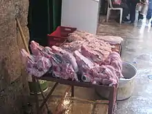 Lebanese meat dishes are usually made with chicken or lamb, though pork is also eaten (albeit not as widely, due to Islamic dietary laws).[1] However, meat is expensive everywhere and not always readily available. Meat was traditionally precious and usually served on the weekend. It is sometimes eaten mixed with bulgur to prolong the shelf life.
