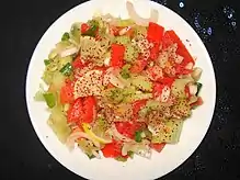Vegetarian cuisine plays an important role in the cuisine of Lebanon. Being located in the Levant, vegetables and herbs (wild or cultivated) are abundant in the fertile landscape and serve as a main base of the cuisine.[69] For Lebanese Christians, including Catholic (Maronites and Melkites) and Orthodox, fasting from meat is practiced over the Lenten period (from midnight to noon) during Easter. Where abstention of meat is observed, the food is referred to as akl aateh (meaning food "cut" from the diet, such as meat or absent from meat). The particular food that is "cut" varies over different traditions.[70]